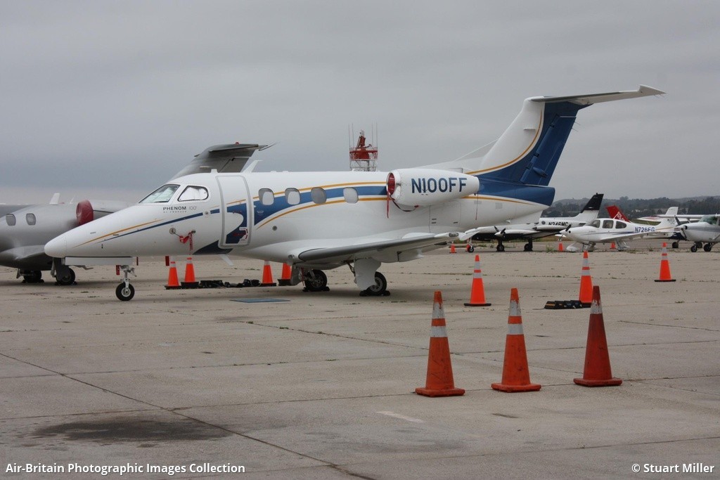 The cabin of N100FF is configured as a four-place club layout with forward wardrobe and an aft enclosed flushing lavatory, finished in the factory Agate interior with light taupe seating and mahogany laminate cabinetry. Avionics for this airframe are listed as Embraer Prodigy Touch / Garmin G1000, with many 2010 examples incorporating Prodigy/G1000 synthetic vision; this fit supports single-pilot operation typical of light business jets. Operationally, the airframe’s seating, range of 1,178 nm and cruise of 390 kts position it for short to mid-range corporate and charter missions operating from bases such as its owner’s Scottsdale, AZ location. Maintenance considerations follow standard Embraer multi-engine fixed-wing schedules for the type and powerplants.