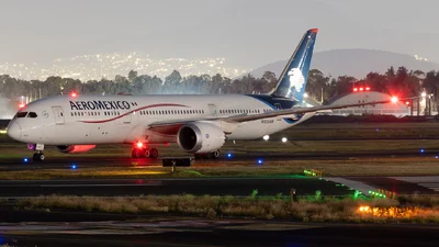 The aircraft is fitted for airline service in Aeroméxico’s long-range three-class layout while retaining a certified maximum seating capability of 422; typical in-service layouts for this airframe class operated by carriers are reported in the mid-200s (approximately 274–422 depending on specific operator fit and regulatory agency figures). The flight deck is equipped with an integrated modern avionics suite from the Honeywell / Rockwell-Collins family as commonly fitted on 787 platforms, with final fit varying by operator. Mission profiles for this airframe are long-range international routes consistent with its extended transoceanic range and cruise performance, with operator maintenance and scheduling reflecting typical widebody long‑haul airline practices.